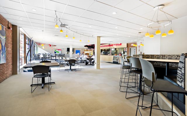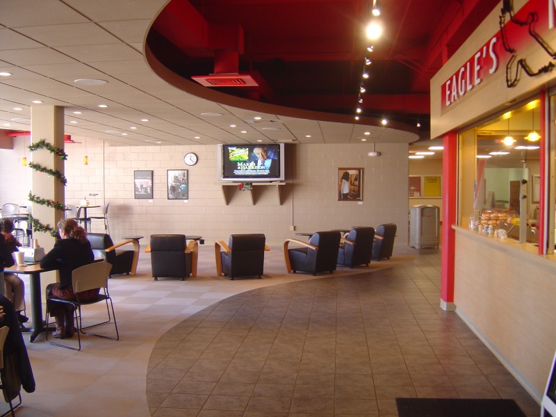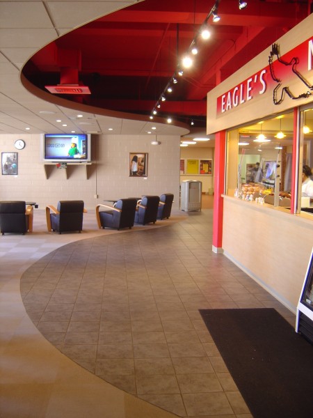 Wiley|Wilson provided architectural and engineering design services to transform a student lounge into a campus center space that reflects the youth that occupy it. Contemporary furniture, vibrant colors, sweeping ceiling and floor tile designs breathe new life into this college hang-out.