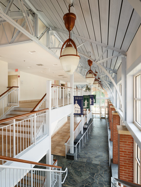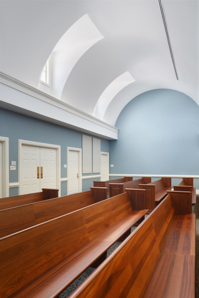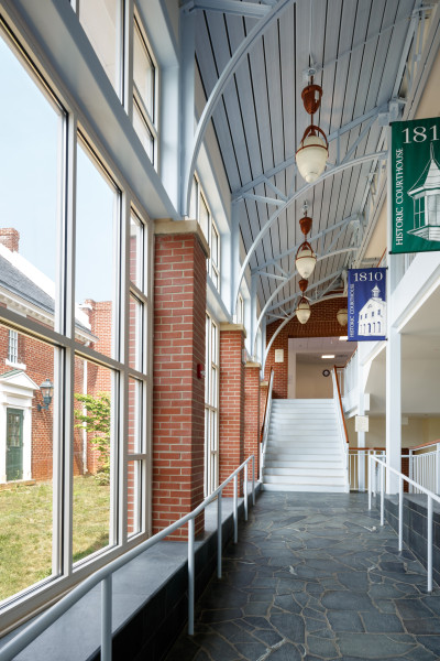 The architectural scaling and detailing of the new construction was sympathetic to the adjacent historic courthouse. The new facility consists of a new court and public safety building and renovated Old Jail and Sheriff’s Offices, which incorporates the new construction by way of a new connector. This connector serves as the new public entrance and security screening area while also providing ADA compliant access to multi-floor levels between the old and new buildings. The 1809 courthouse received a new roof and security upgrades.