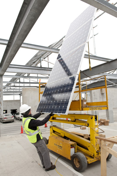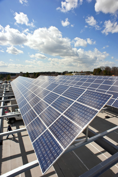 In an effort to restructure energy use around renewable sources Wiley|Wilson teamed with Siemens Industry, Inc. on the installation of a new 400 photovoltaic panel, 100-kilowatt array above a five level parking structure. The 100-kilowatt array produces an annual energy output of approximately 136,000 kilowatt-hours, or 13 percent of the annual energy output of the parking garage.